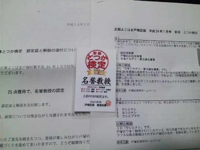 先日自宅に届いた封書。差出人が『戸塚区役所広報相談係』???区役所から連絡?税金はちゃんと払ってるぞ。健保も払ってるし。。。何事?と思って気になってしまい玄関まで歩きながら開けてしまいました。そして出てきたのがこれら。『とつか検定名誉教授認定書』あ~、そう言えば広報誌に載っていたのをやったわ。とりあえず調べながらやったら全てわかる問題やったけど。副賞はハズレましたとのことやけど、何やったんやろ。忘れた。。。また何か載ってたらやってみよ。