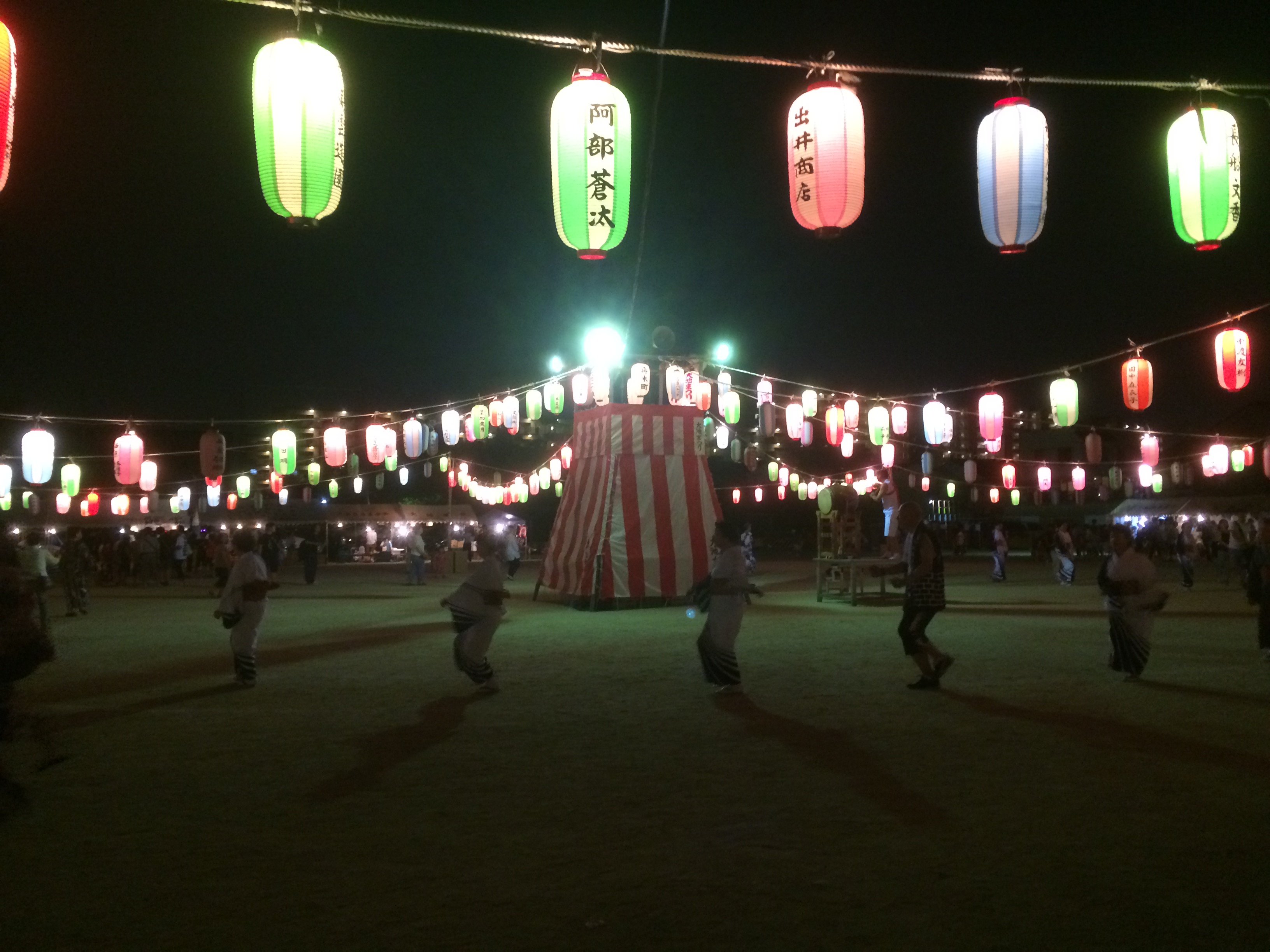 校庭の真ん中に櫓があっておばちゃん達が盆踊り。