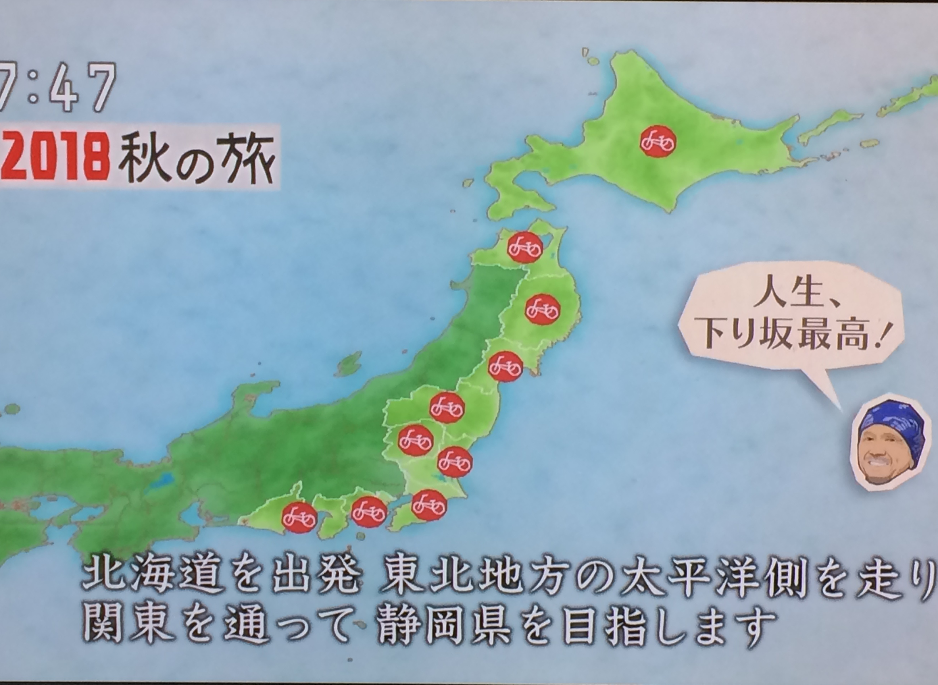 NHK-BSプレミアム(3ch)で春と秋に放送されている、俳優の火野正平さんがスタッフと自転車で日本列島を縦断する旅?番組です。