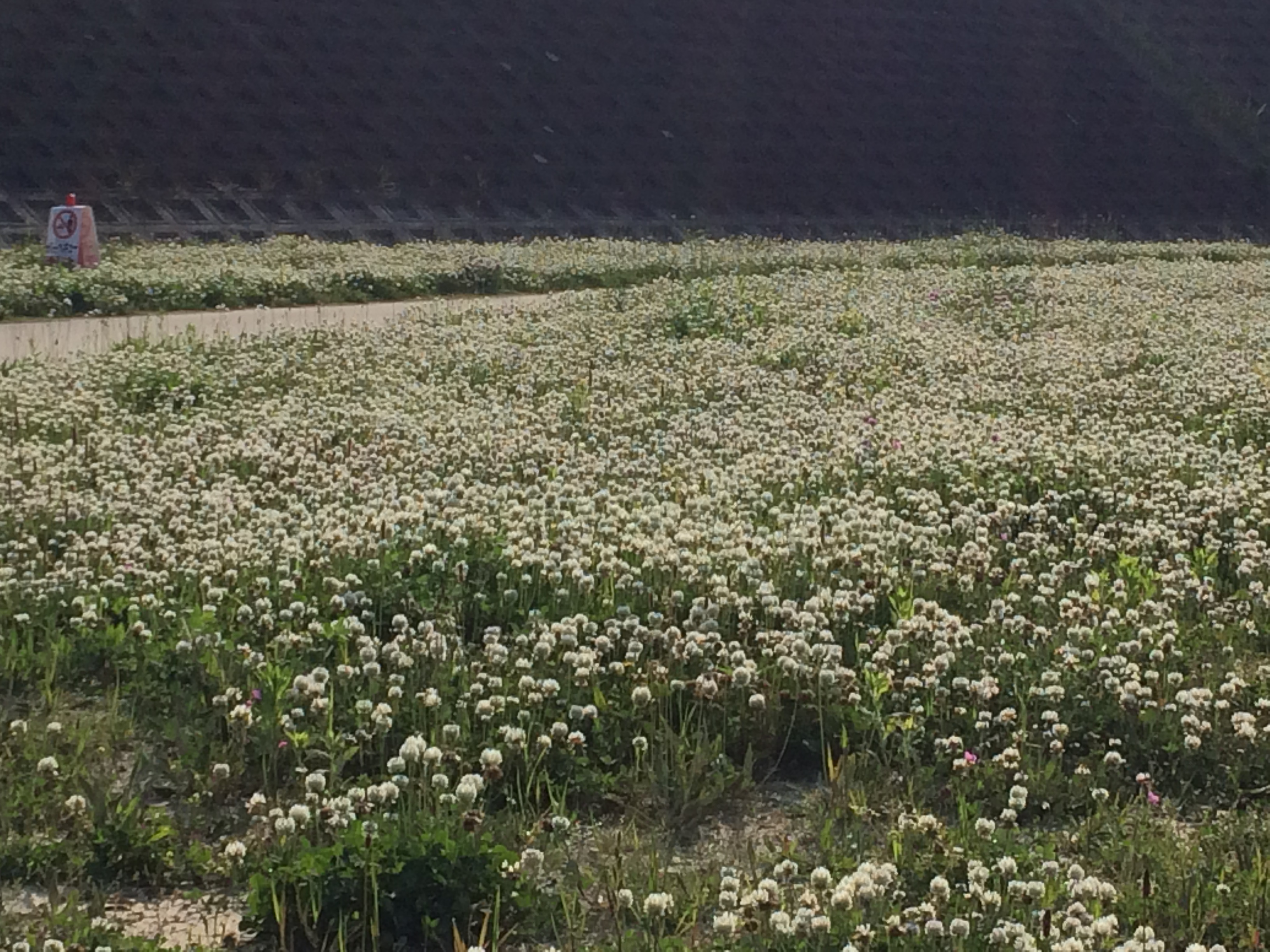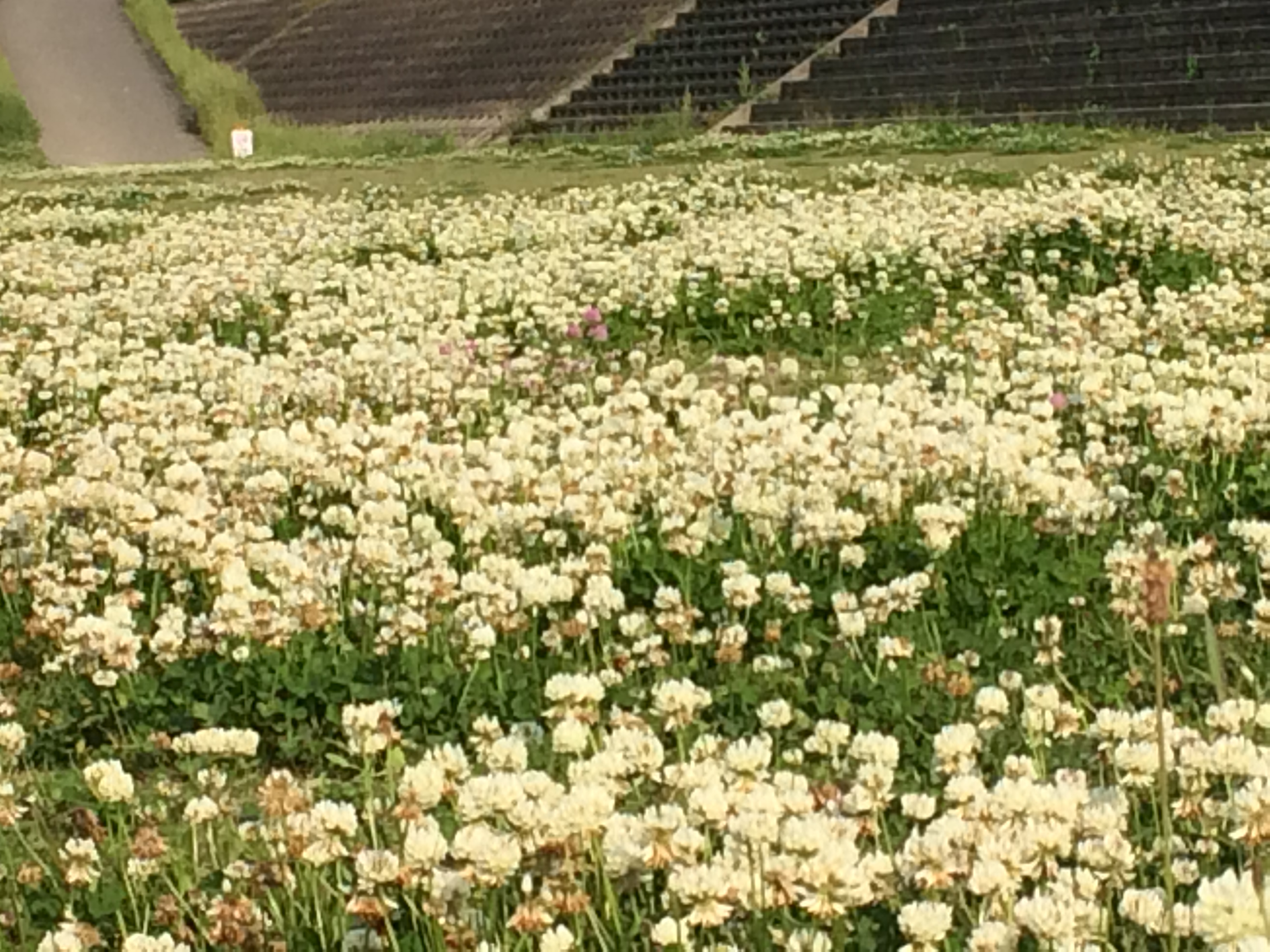 今、安威川の河川敷はシロツメクサで埋め尽くされています。