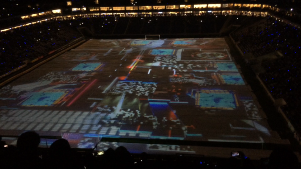 試合後にグラウンドに白い布が敷かれてそこに20台のプロジェクターを使用して映像を映し出しました。