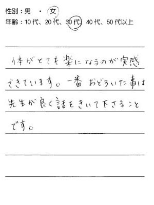 自分が思っていなかった所がこっていたのにはビックリしました。 とても楽になりました。本当にありがとうございました。 今まで受けてきた診療で一番よかったです。