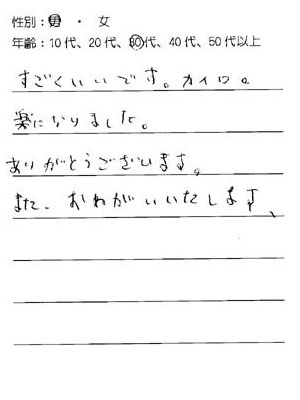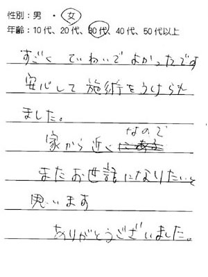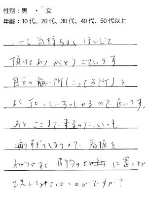 当院をご利用された方から「ご意見箱」に頂いた、ありがたいお言葉の一部です。 「ご意見箱」は更衣室にを設置しております。 ご利用時にはご意見、ご質問など何でも結構ですので、ぜひ感想をご記入いただければと思っております。 今後、順次全てのお言葉を掲載させて頂きたいと思っております。 (PCサイトには全て掲載させて頂いております)