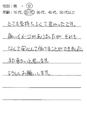 とても気持ちよくて良かったです。 痛いイメージがありましたがそれもなくて安心して受けることができました。また来たいと思います。 よろしくお願いします。
