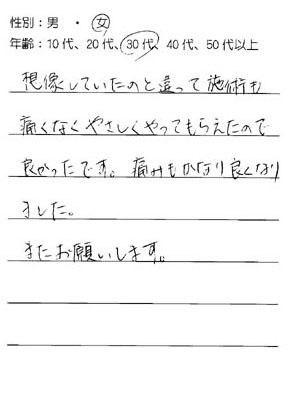 想像していたのと違って施術も痛くなくやさしくやってもらえたので良かったです。痛みもかなり良くなりました。 またお願いします。